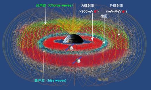 在地球上空大约1.2至7个地球半径的空间区域分布着大量的高能带电粒子(主要为高能质子和电子)。这些高能带电粒子除了围绕地球磁场线做回旋运动和沿着磁场线在南北磁镜点之间做弹跳运动之外,还围绕着地球做方位漂移运动并形成地球辐射带(如图1所示)。辐射带高能粒子严重地威胁着航天器和宇航员的安全。其中,能量达到兆电子伏特(MeV)以上的高能电子可以穿透卫星绝缘层并造成卫星深层充电甚至完全毁坏,因此被称为卫星“杀手电子”。尽管辐射带被发现50多年了,但是辐射带高能电子的数量和空间分布变化机理一直是空间科学界尚未解决的科学难题。