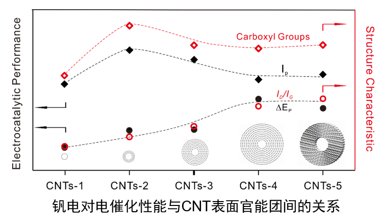 随着化石能源资源的日益枯竭及其使用带来的环境问题,基于电化学反应的清洁能源存储与转化技术在未来能源与环境的可持续发展中正扮演着越来越重要的角色。其中,基于电催化反应的电化学能量存储与转化器件(如燃料电池、液流电池)由于清洁、高效等优点而备受关注。在化学能与电能之间的转换过程中,电催化剂是决定反应速率、能源转换效率以及器件功率的关键材料之一。由于活性和稳定性等因素的限制,目前电催化剂普遍依赖贵金属催化剂,如铂、钯等。因此,开发非贵金属催化剂是目前电化学能量存储与转化器件研究领域亟待解决的问题。碳纳米管(CNT)作为一种具有优异导电性能的一维纳米碳材料被广泛用作纳米电催化剂载体和非贵金属催化剂。现有研究表面不同壁数的碳纳米管作为电催化剂时,其电催化活性存在显著差异,但其内在机制并不明晰。