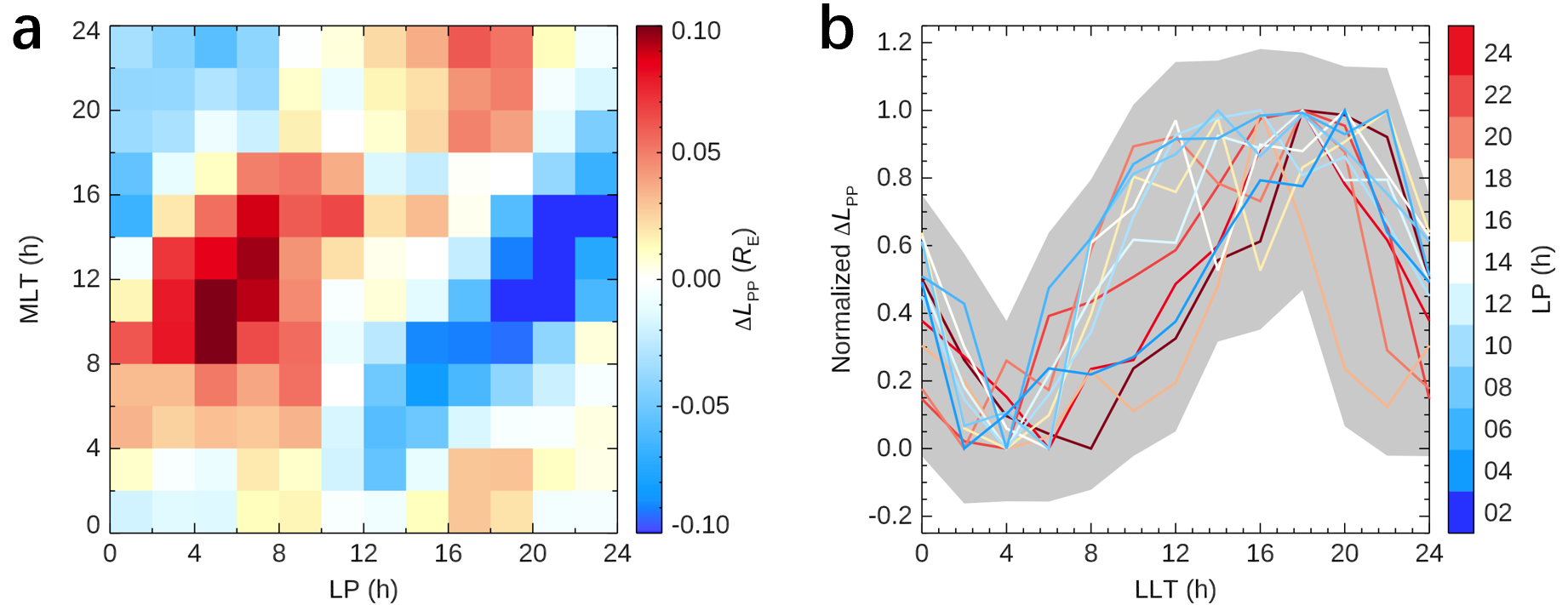 图2.等离子体层顶潮汐信号的直接观测证据。(a)等离子层顶的扰动幅度(∆Lpp,单位为 地球半径RE,1RE=6371公里)随月相(LP)和磁地方时(MLT)的变化情况,(b)将不同月相下的归一化的扰动等离子层顶位置转换到月球地方时(LLT)的结果,可以清晰地看到等离子体层月潮存在全日周期和全月周期,且高潮只有一个并出现在月球地方时的昏侧(LLT=18点)附近,其相位领先月球约90度,对应的低潮也只有一个且出现在月球地方时的晨侧(LLT=6点)附近。
