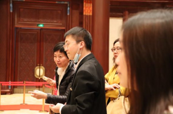雁栖湖国际会议中心作为国家级会议中心,近年来曾举办了亚太经合组织(APEC)峰会、“一带一路”国际合作高峰论坛等世界级盛会,是提升北京“世界城市”地位的重要元素。其以“鸿雁展翼,汉唐飞扬”为设计理念,寓意友好往来,生态契合。老师们走进集贤亭,迎面而来的是巨型圆桌,红木圈椅围坐,古风文集齐置,木质浮雕环绕四周,木雕国画屏风后置,层叠立体的雕刻将国画生动地呈现在大家眼前,熠熠夺目,顶部的雕梁画栋与景泰蓝工艺相结合,雅致通透,每一处都展现着华贵典雅的中式风。在讲解员的介绍中,大家感受着古今文明的激扬碰撞与多元文化的交融并存,感叹着中国传统文化的博大精深与极致的匠心精神。