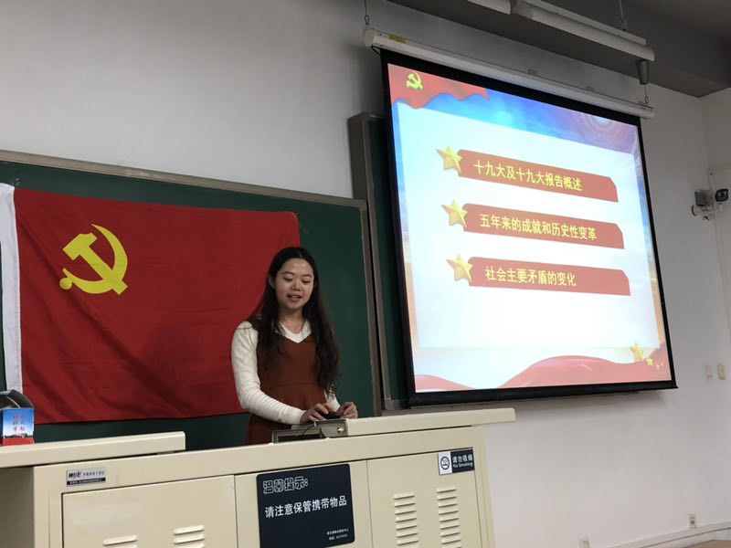 第二报告人于秋曼同学进行了宣讲,她回顾了我国从新时代以来的重大判断,五年来的重大成就和历史性变革。从政治,经济,文化等多个角度对五年来的成果进行了总结,并介绍了新时代中国的“大国外交”征程。之后,于秋曼同学着重介绍了十九大精神中关于“主要矛盾变化”的部分,并对此进行了总结。